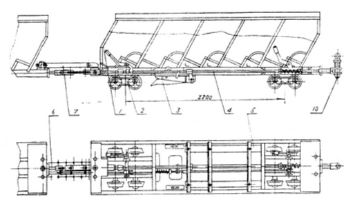 整個列車由兩節(jié)頭車及一定數(shù)量的掛車和尾車用三環(huán)鏈串連組列而成。由提升機牽引列車之首的S1頭車運行。每節(jié)頭車上設(shè)有開動裝置,帶有一個輪對的制動裝置、緩沖裝置,帶有一個輪對的滑動棚架、閉鎖裝置等。兩節(jié)頭車的主拉桿用Φ18×64的7節(jié)環(huán)形鏈連接起來,從而使兩個結(jié)構(gòu)獨立的開動裝置的撞塊能同時打開獨立安在兩臺頭車上的制動裝置達到同步抓捕。四對抱爪同時定點抓住鋼軌后,掛車連同頭車滑動棚架一同因緩沖器迅速吸收了運動能量而減速下滑,頭車滑動棚架下的輪對與制動架下邊的輪對,兩軸拉開的距離就是緩沖距離,最大達1.4米。